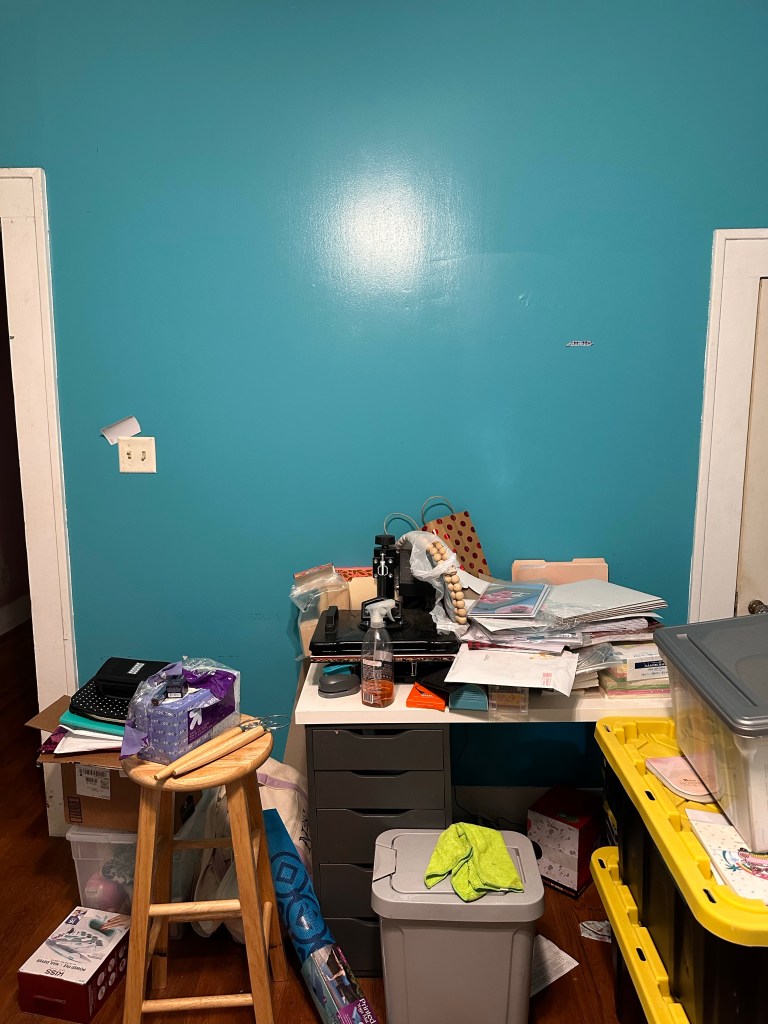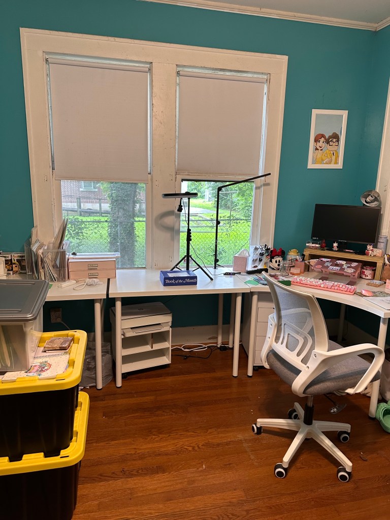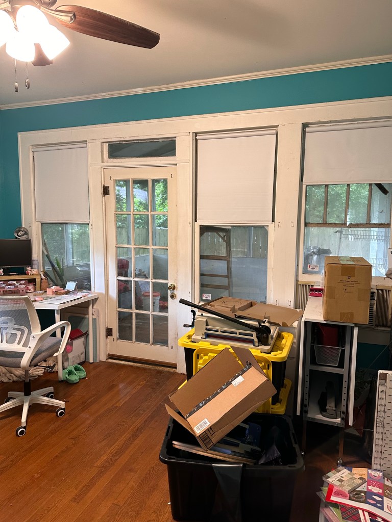 We are going to start renovating our home sometime next year, so of course I have started thinking about how I want office to look. I have already decided that the walls will be light gray and the bulk of the furniture will be white. Right now the walls are a turquoise color and there are there are five window and a glass pane door. Check our he photos below for more information
